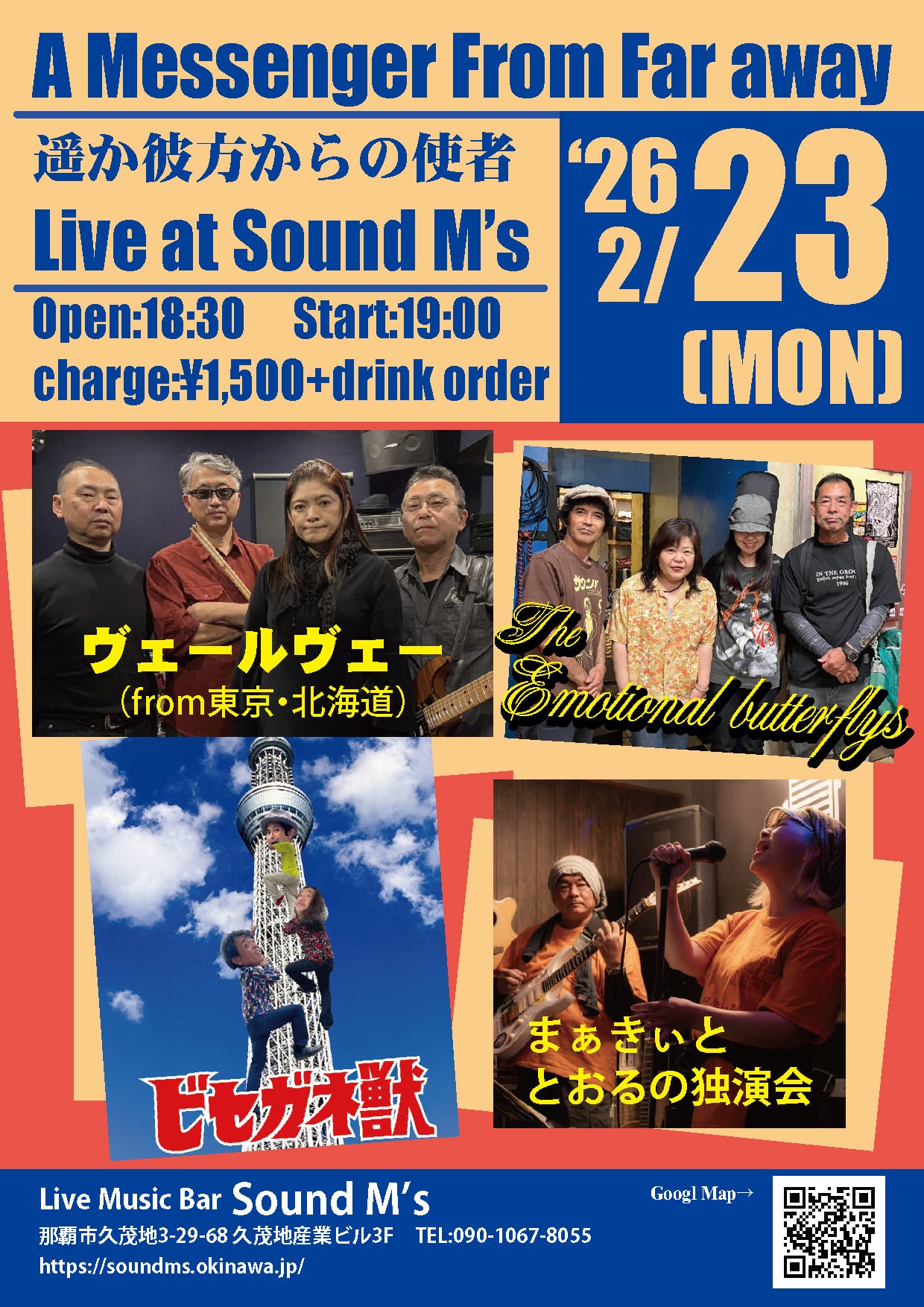 A messenger from far away 遥か彼方からの使者 Live 2025.12.29 A messenger from far away遥か彼方からの使者Live at SoundM’s 26/2/23(月)Open:18:30Start:19:00charge:¥1,500+drink order 出演 The Emotional butterflys まぁきぃととおるの独演会 ヴェールヴェー(from東京・北海道) ビセガネ獣